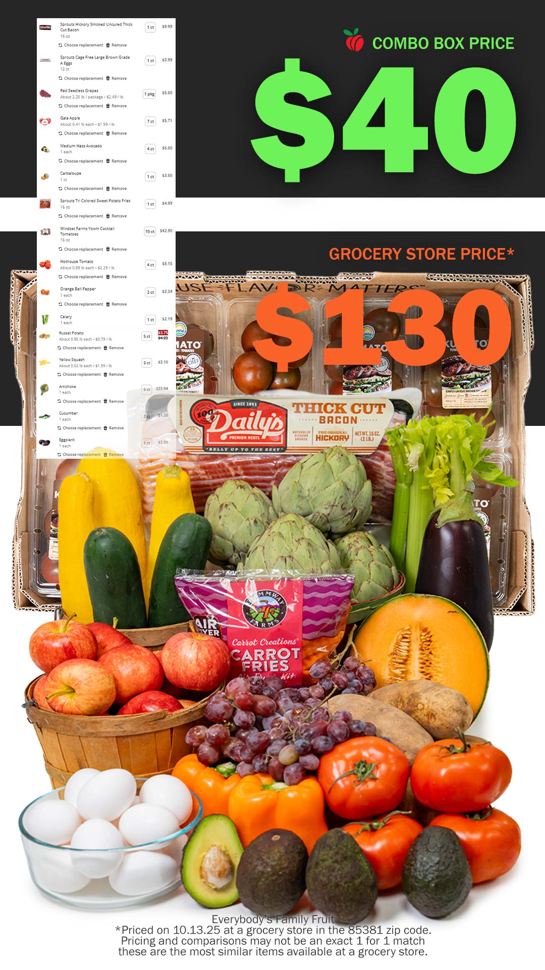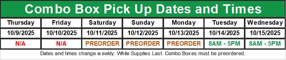 Combo Boxes must be preordered. Combo Boxes are as is. Quality and fulfillment of items must be checked before leaving our premises. Any questions or concerns with our Combo Box must be handled on site. Pickup at 8990 West Windsor Drive, Peoria, Arizona 85381. If you are unable to pick up your box on the day you have selected, please let us know. Boxes not picked up on scheduled day are considered forfeited. If anyone has issues ordering on the site, please email us at info@everybodysfamilyfruit.com or call us at 602.254.8643.
