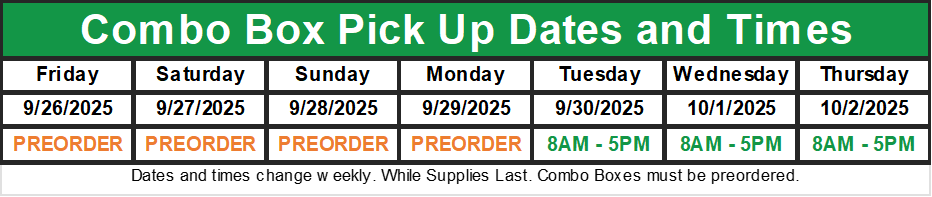 We have our list for individual items available now with Combo Box pickups. Our list from last week can be found on this post at Everybody’s Family Fruit 9.22.25 – 9.27.25 Soon we will be adding a new post for this week’s sales so please keep an eye out and check that post for what is available. Thanks Barbara.