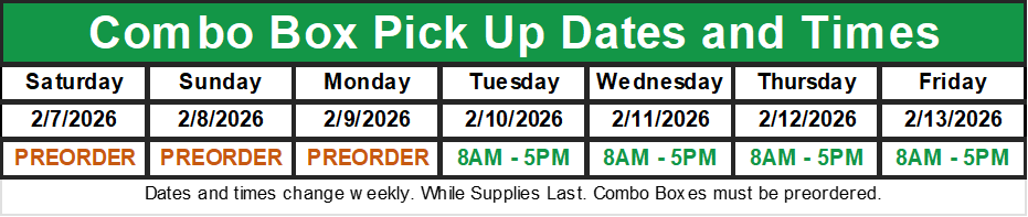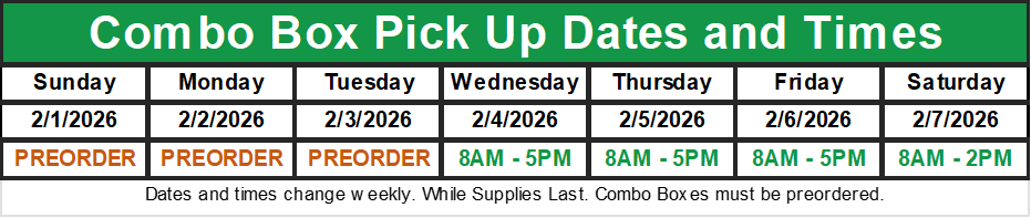 Combo Boxes must be preordered. Combo Boxes are as is. Quality and fulfillment of items must be checked before leaving our premises. Any questions or concerns with our Combo Box must be handled on site. Pickup at 8990 West Windsor Drive, Peoria, Arizona 85381. If you are unable to pick up your box on the day you have selected, please let us know. Boxes not picked up on scheduled day are considered forfeited. Purchase your Combo Box online, boxes purchased in person will receive an extra $5 charge. If anyone has issues ordering on the site, please email us at info@everybodysfamilyfruit.com or call us at 602.254.8643.